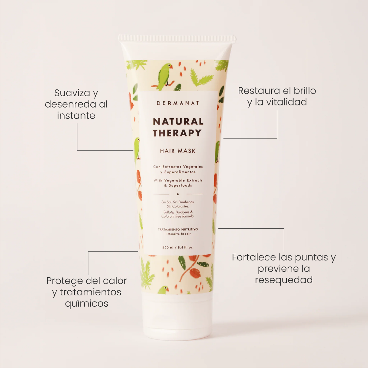 - Hair Mask: Mascarilla de tratamiento intensivo con aminoácidos, extractos y aceites de origen natural que reparan y nutren tu pelo fortaleciendo las puntas y dejándolo suave y sedoso.
