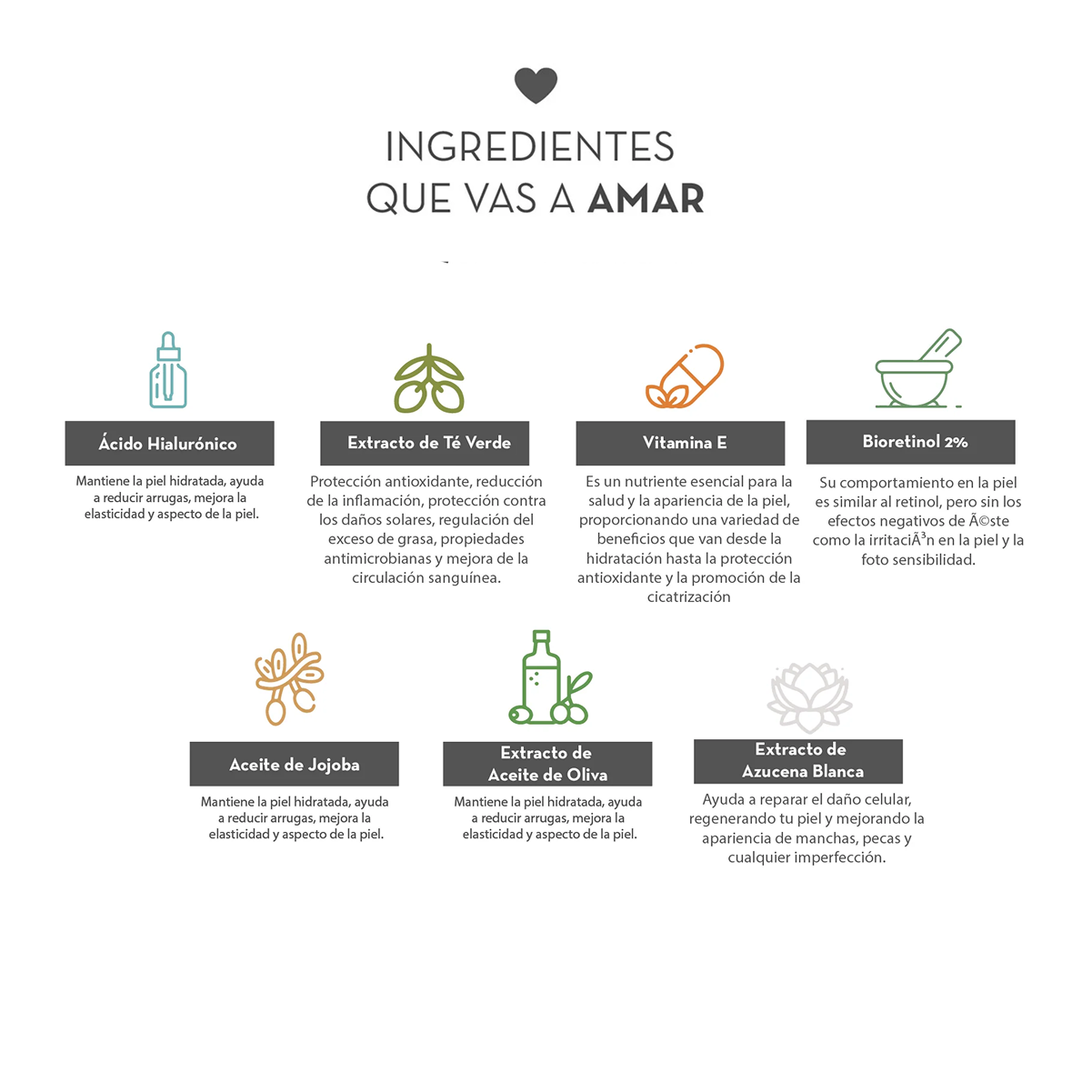 Tratamiento antiedad de última generación que ofrece todos los beneficios del retinol sin irritar la piel, gracias a su Bioretinol 100% vegetal al 2%, con resultados visibles en menos de 2 meses.